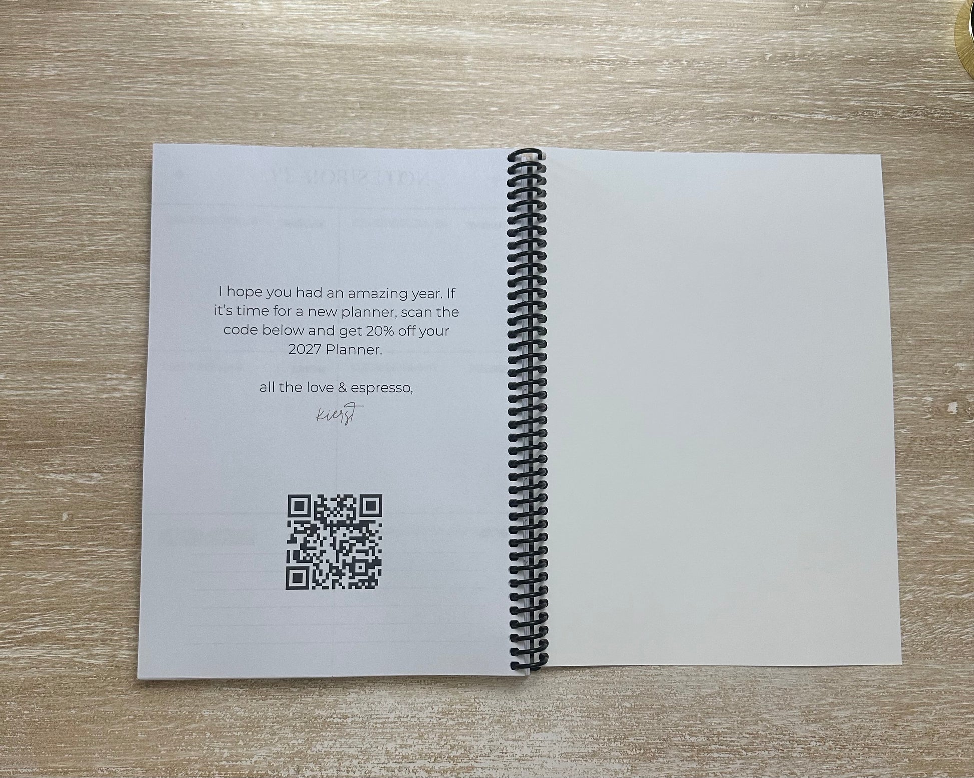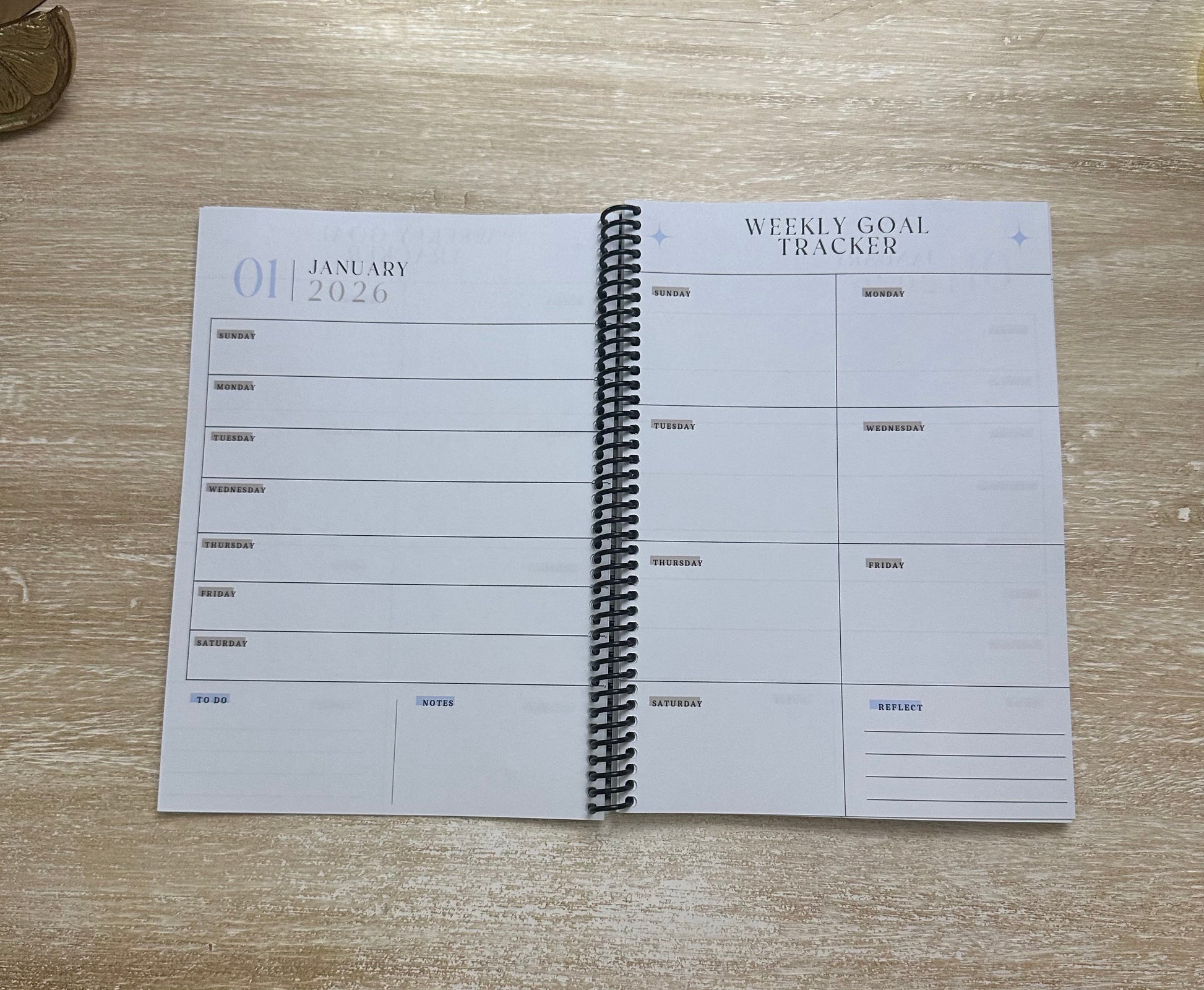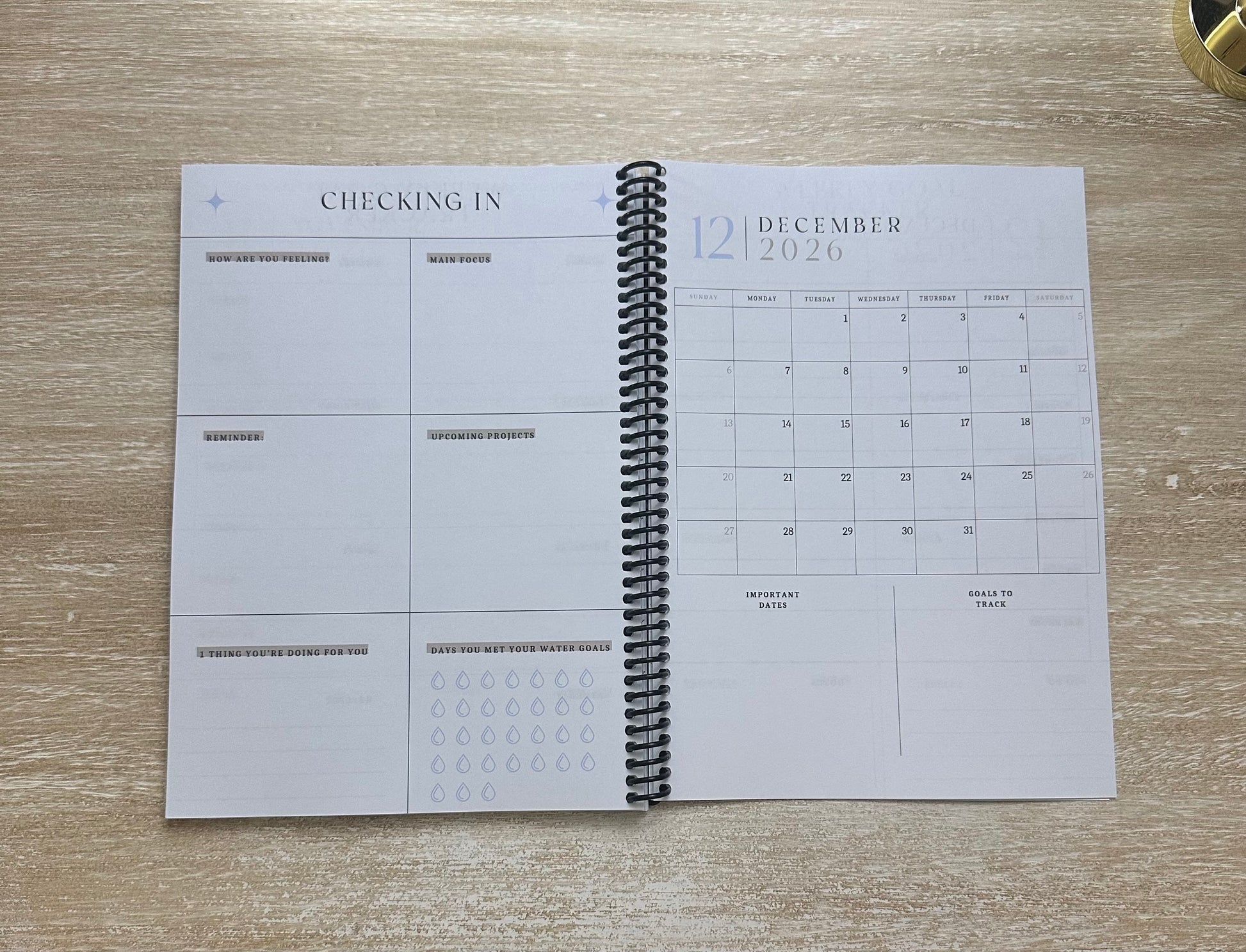 Designed with monthly and weekly layouts, spaces for priorities, to-dos, a water intake tracker, and self-reflection prompts, this 12-month planner keeps your days intentional while leaving room for inspiration.