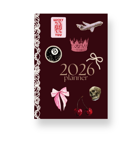 Playful, daring, and entirely unexpected—just like the story it’s ready to hold. The 2026 Planner Signature Velvet Noir Iconic Collage layers deep maroon with a curated collection of icons: lace, cherries, crowns, cards, bows, and more. It’s a wink of rebellion wrapped in elegance, crafted for the client who thrives in contrasts.