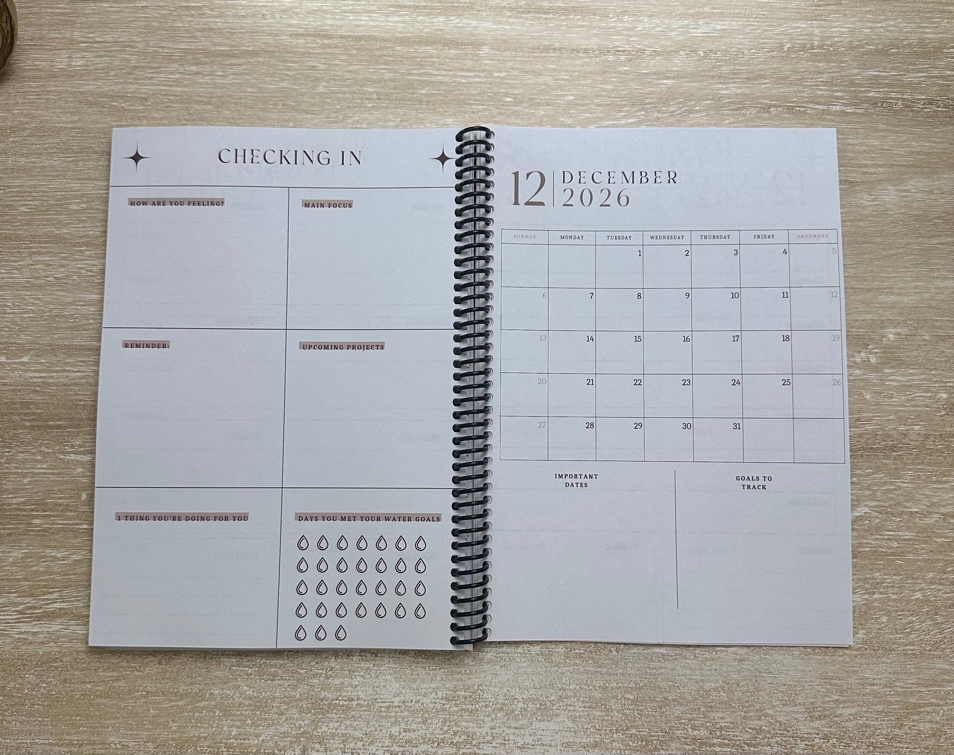 Inside, monthly and weekly layouts provide space for priorities, to-dos, water intake tracking, and self-reflection prompts—designed to keep your schedule structured without sacrificing elegance.