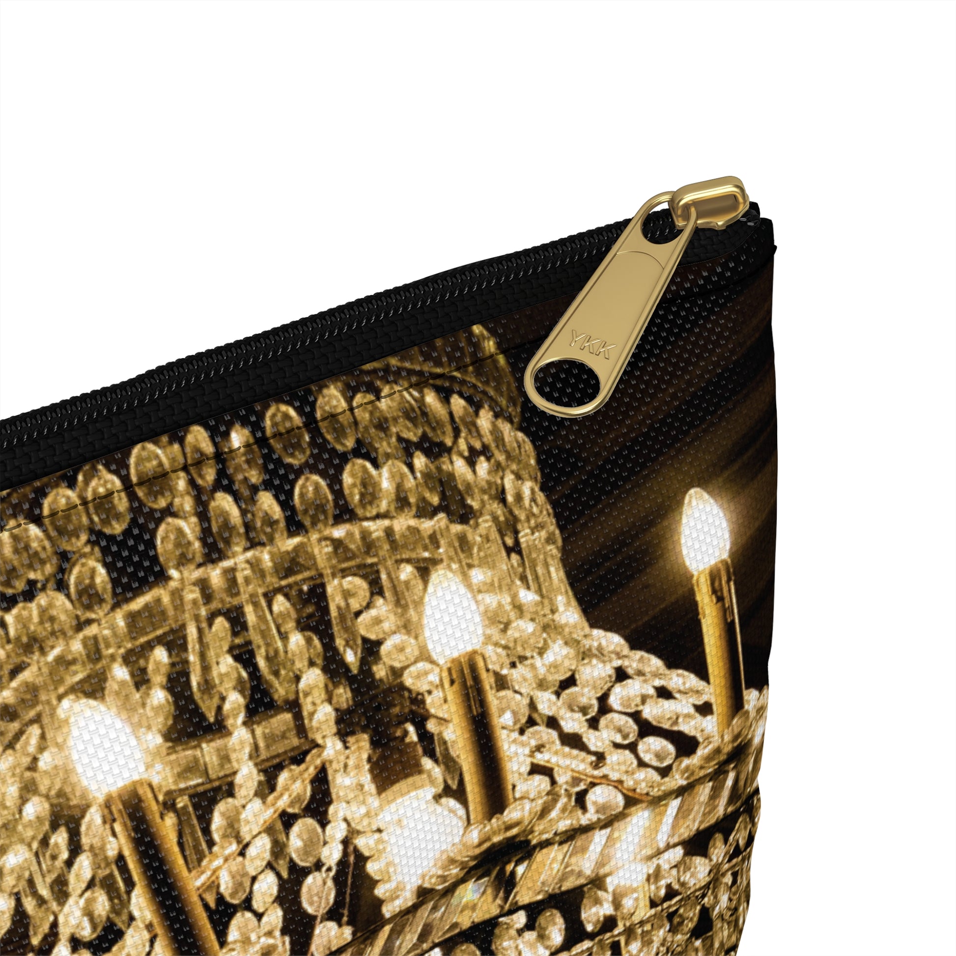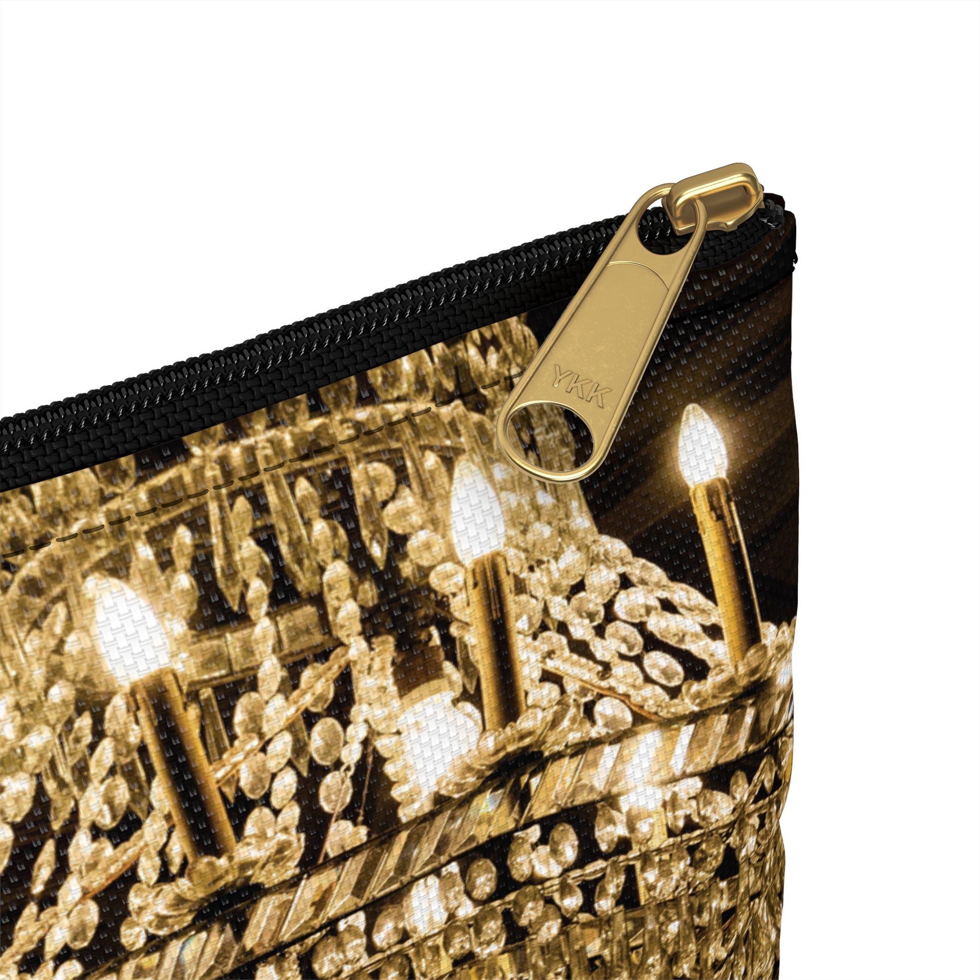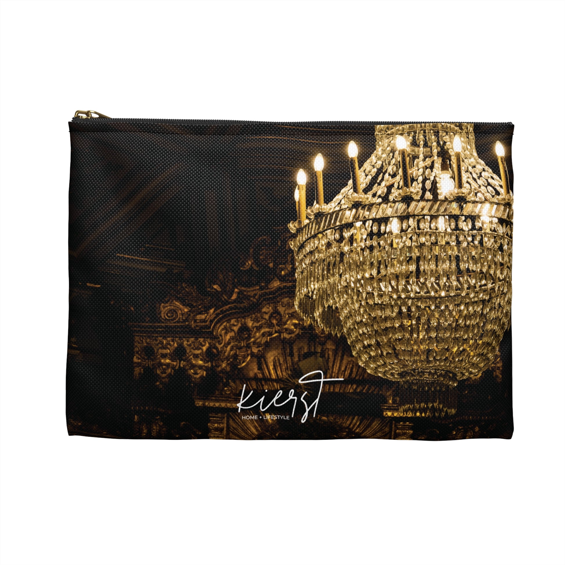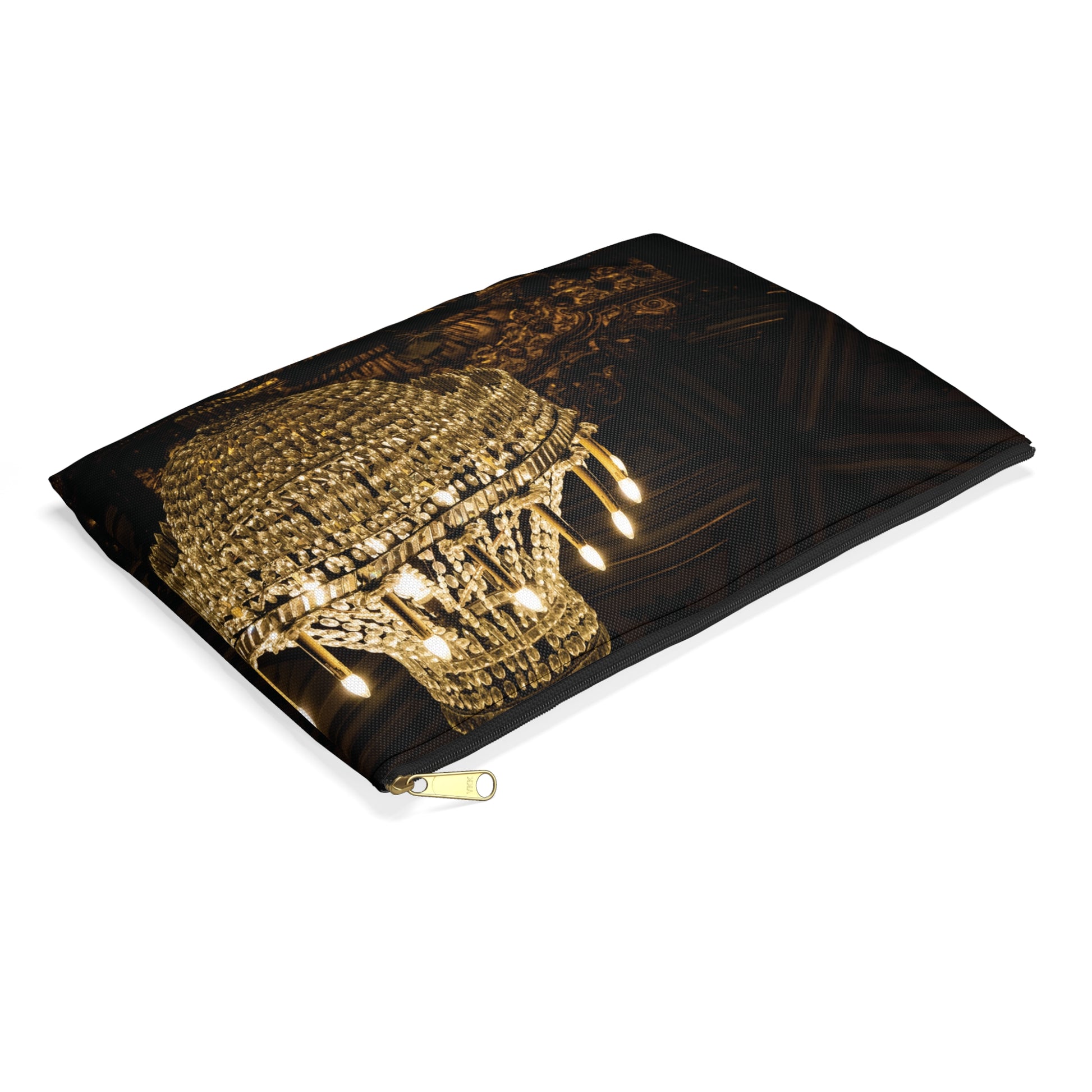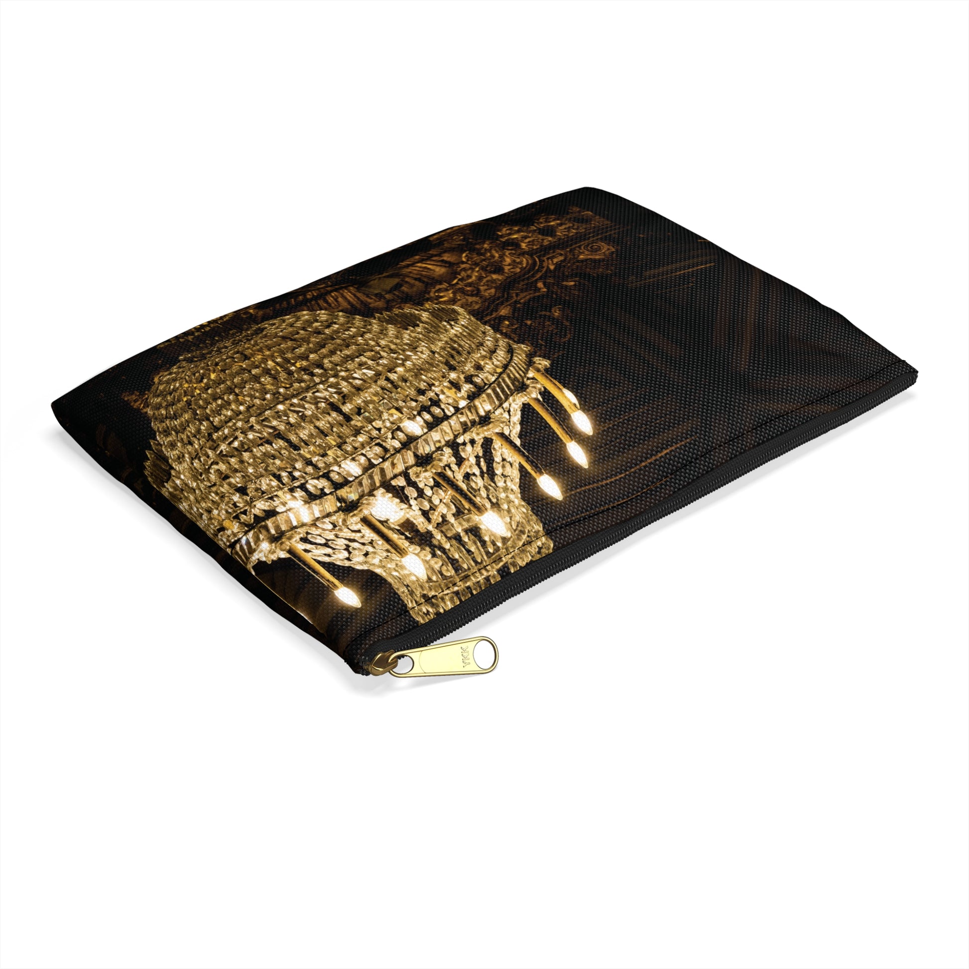 The Baroque Chandelier Accessory Pouch exudes timeless sophistication, featuring an opulent golden chandelier set against a dark backdrop. Perfect for carrying makeup, tech cords, or everyday essentials with a luxurious flair.