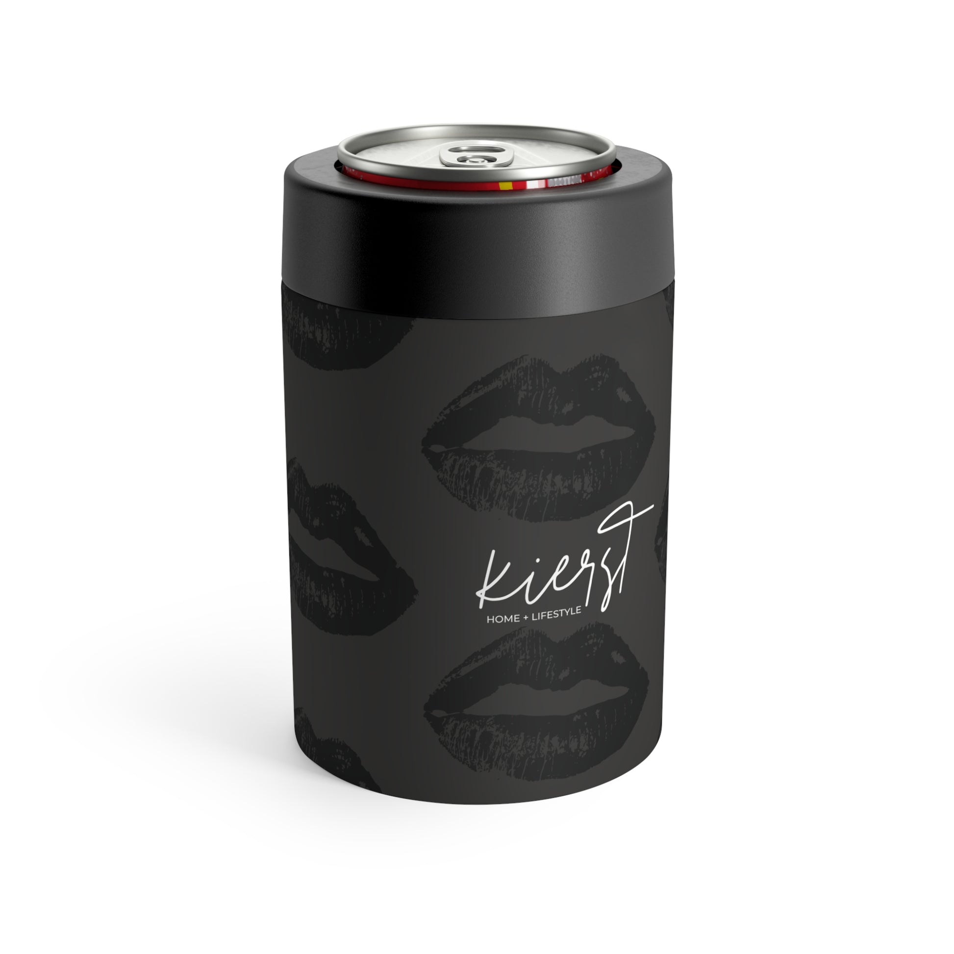 Moody, minimal, and full of quiet edge. This insulated can holder features a deep charcoal grey base layered with soft black lip prints—a signature kierst motif now styled for the bold. Crafted to keep 12oz drinks crisp and cool, it blends function and sophistication with ease. Whether it’s on your bar cart or your desk, it adds an unexpected, elevated twist.