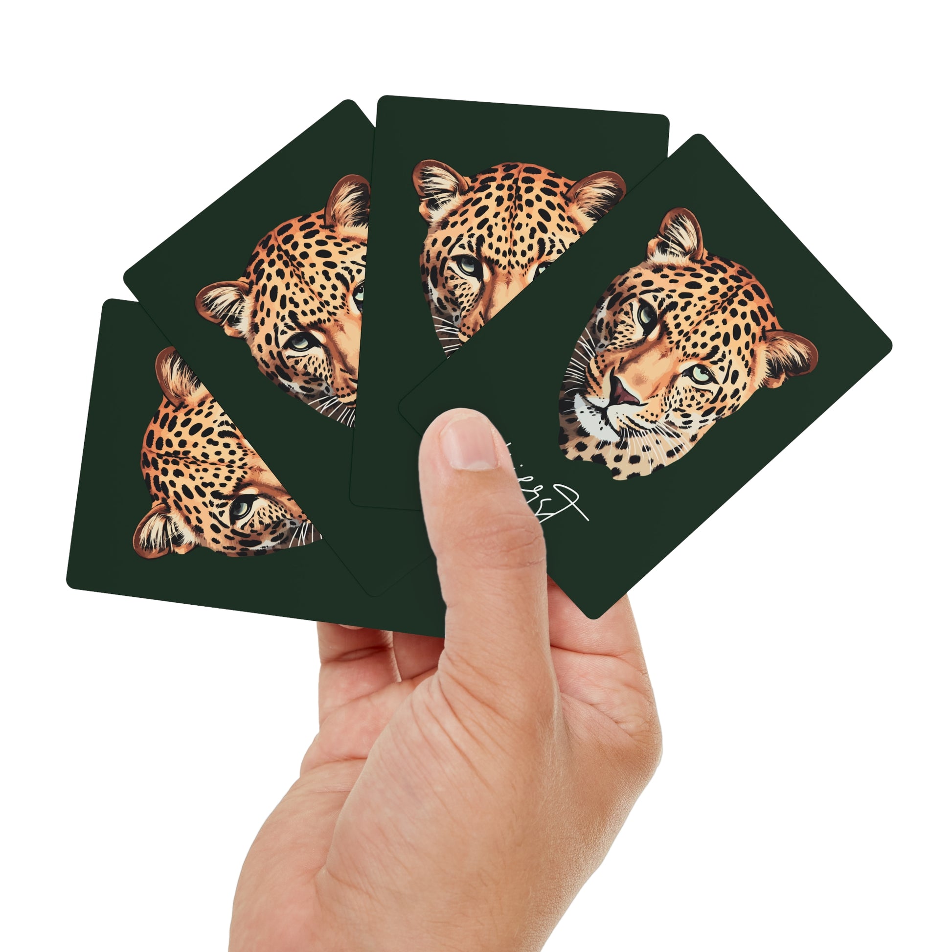 Command attention at the table with the Signature Midnight Pine Poker Playing Cards. A bold leopard head motif set against deep Midnight Pine creates a striking balance of power and poise. Designed to be both functional and collectible, this deck merges timeless sophistication with a touch of the wild.