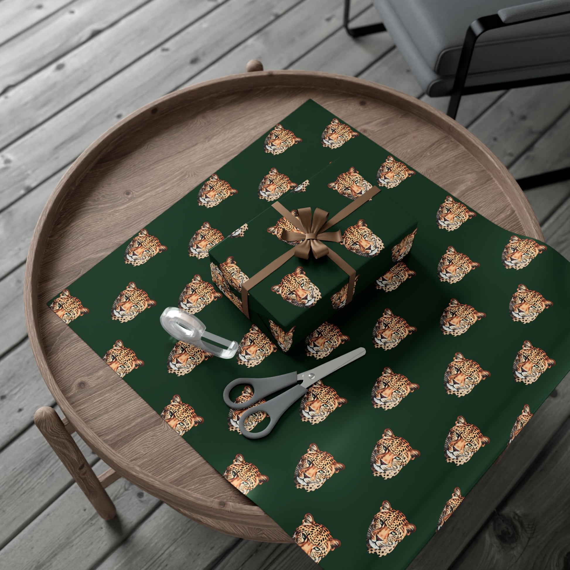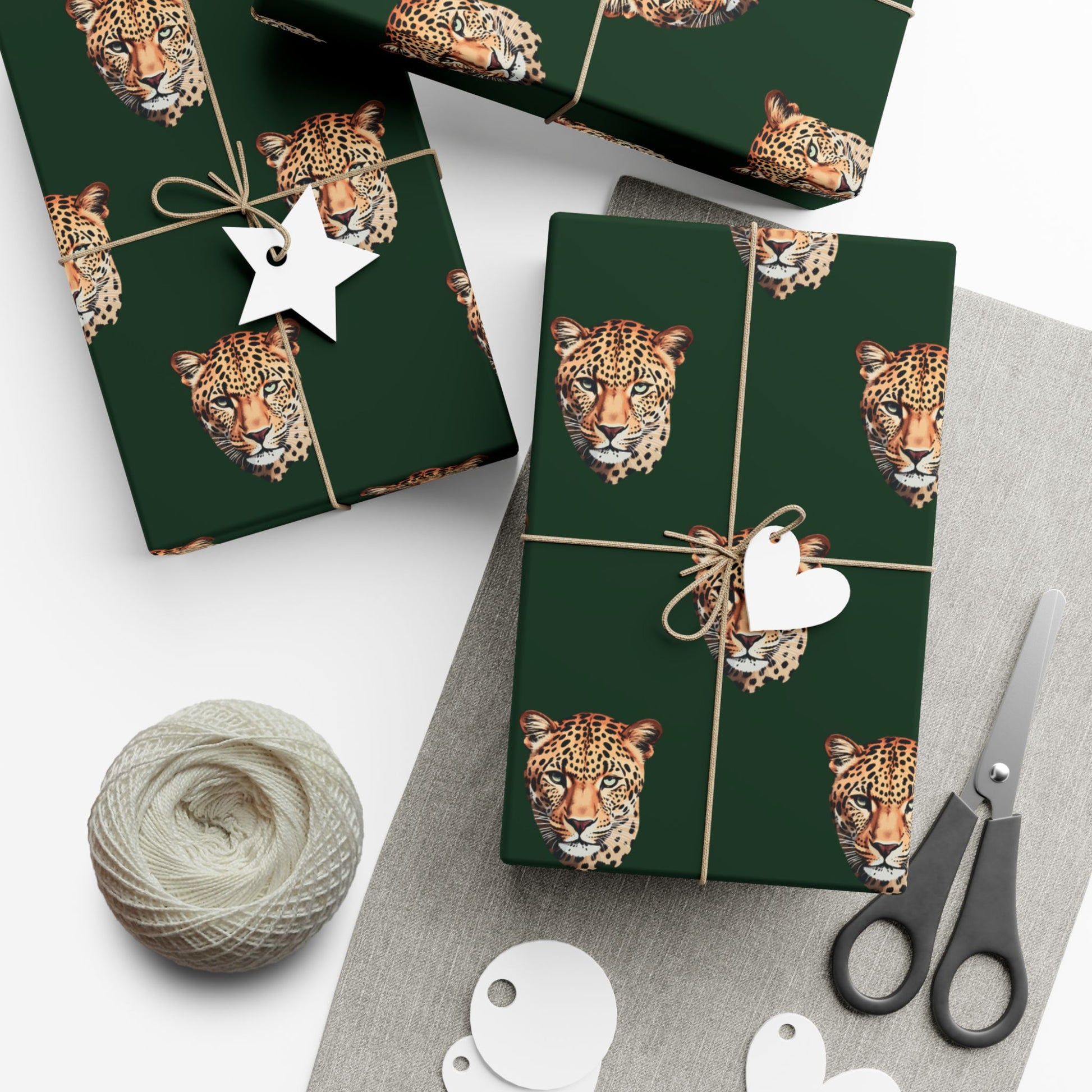 The Leopard Head on Signature Midnight Pine Gift Wrap embodies bold sophistication through an unexpected pairing of elegance and edge. Featuring the signature kierst deep green backdrop and intricate golden leopard illustrations, this design blends modern glamour with timeless confidence—ideal for gifting that makes a statement without saying a word.