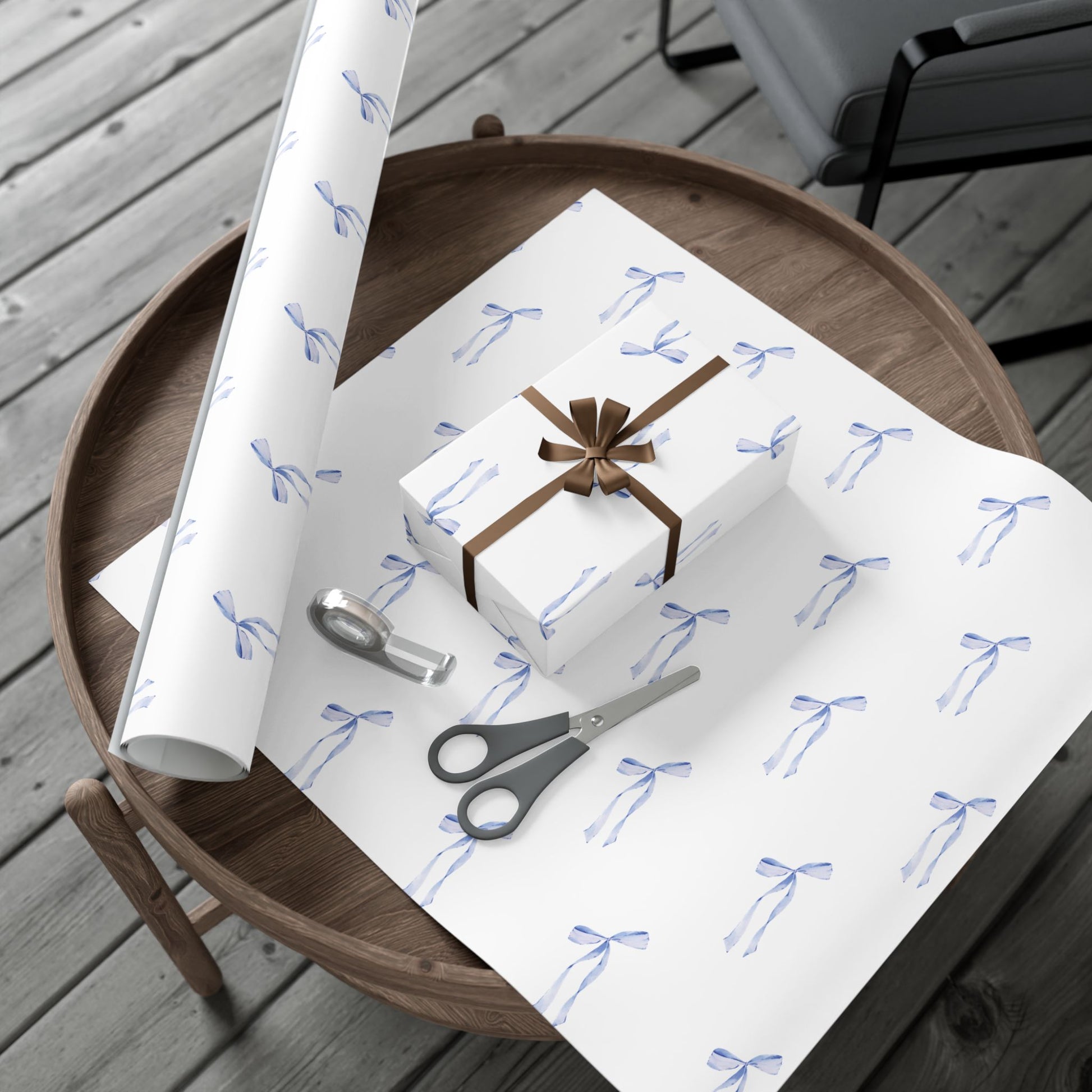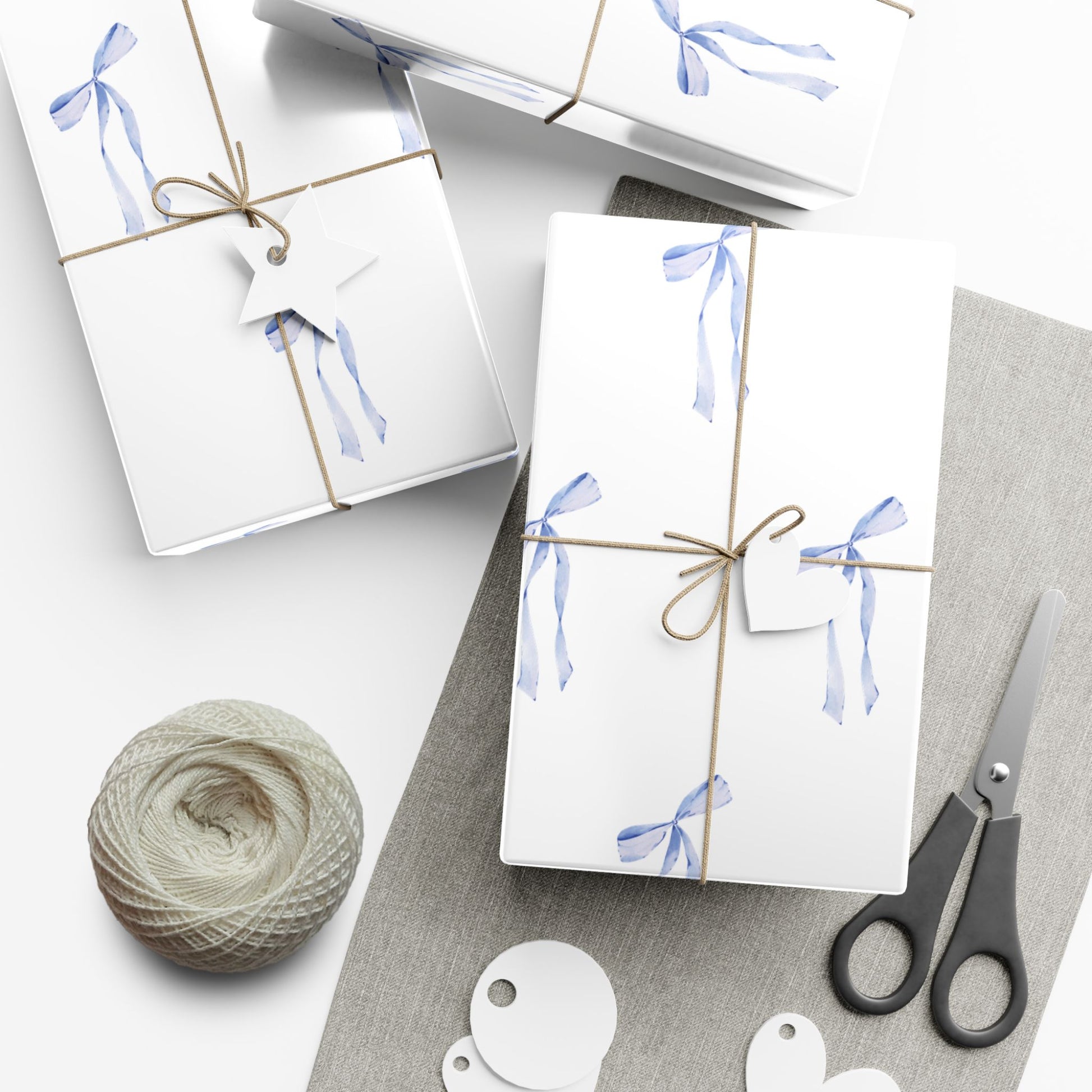 Soft and timeless, the Delicate Blue Bow Gift Wrap features hand-painted ribbon motifs that bring an understated elegance to any occasion. The gentle blue tones on a crisp white background make this wrap ideal for birthdays, weddings, or sophisticated seasonal gifting.