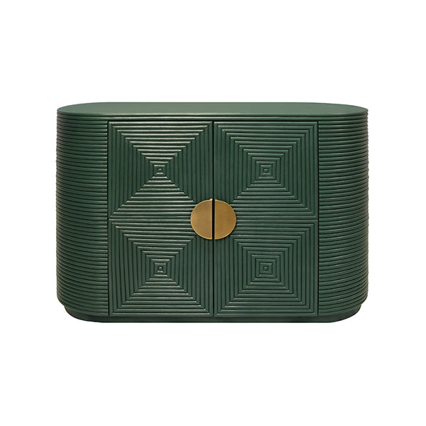 The Roger Cabinet blends sculptural detail with bold color, creating a standout piece for any interior. Crafted in painted hunter green rattan with a reeded surface and curved ends, it’s finished with oversized brass hardware for a touch of modern glamour. Inside, an adjustable shelf adds flexibility for storage or display. Stylish and functional, Roger makes a striking statement in living rooms, dining spaces, or entryways.