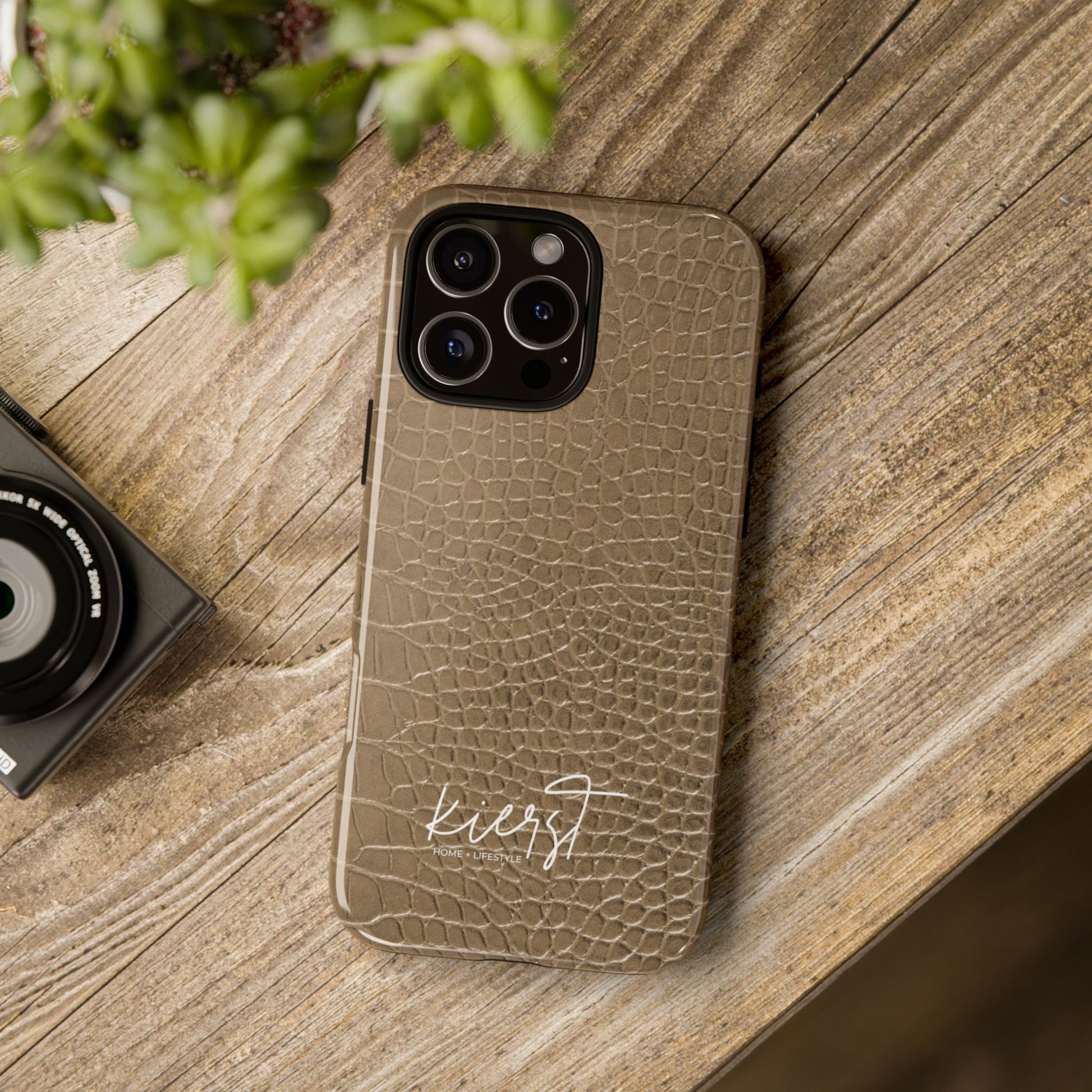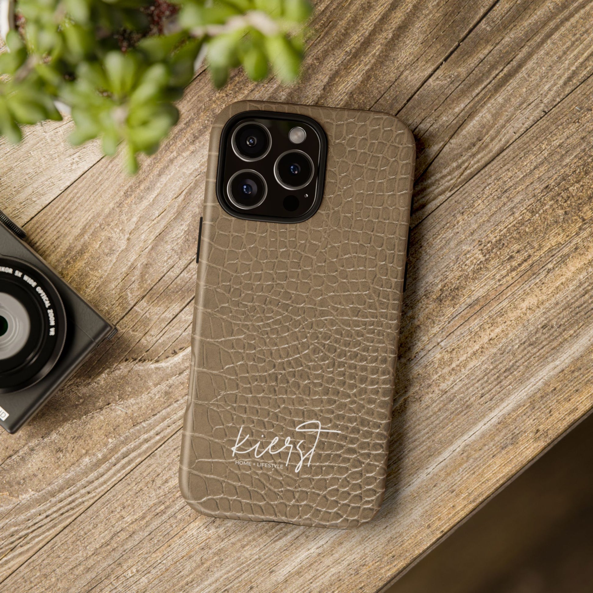 Designed to bring a touch of structure and subtle luxury to your tech, this tan faux-alligator print case adds warmth, refinement, and timeless appeal. The smooth printed finish mimics real skin—without the maintenance—while the dual-layer design protects your phone in style.
