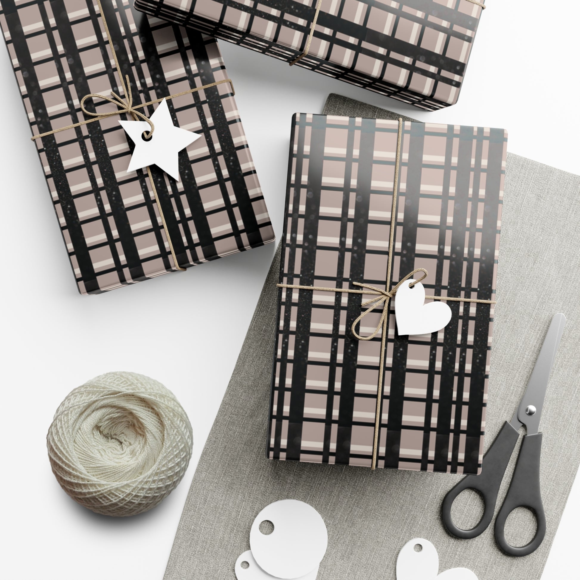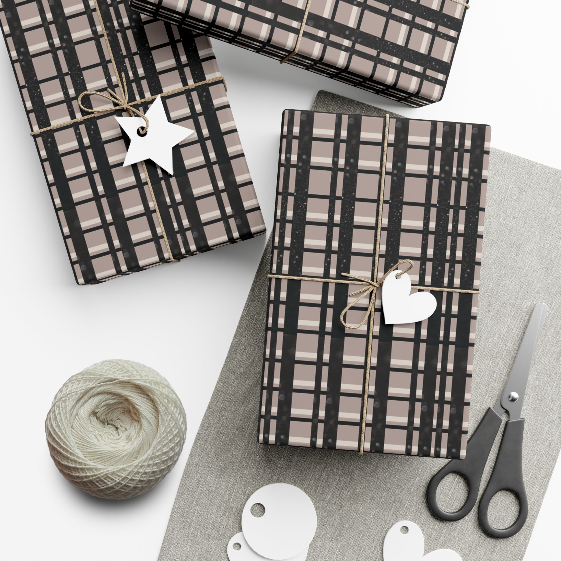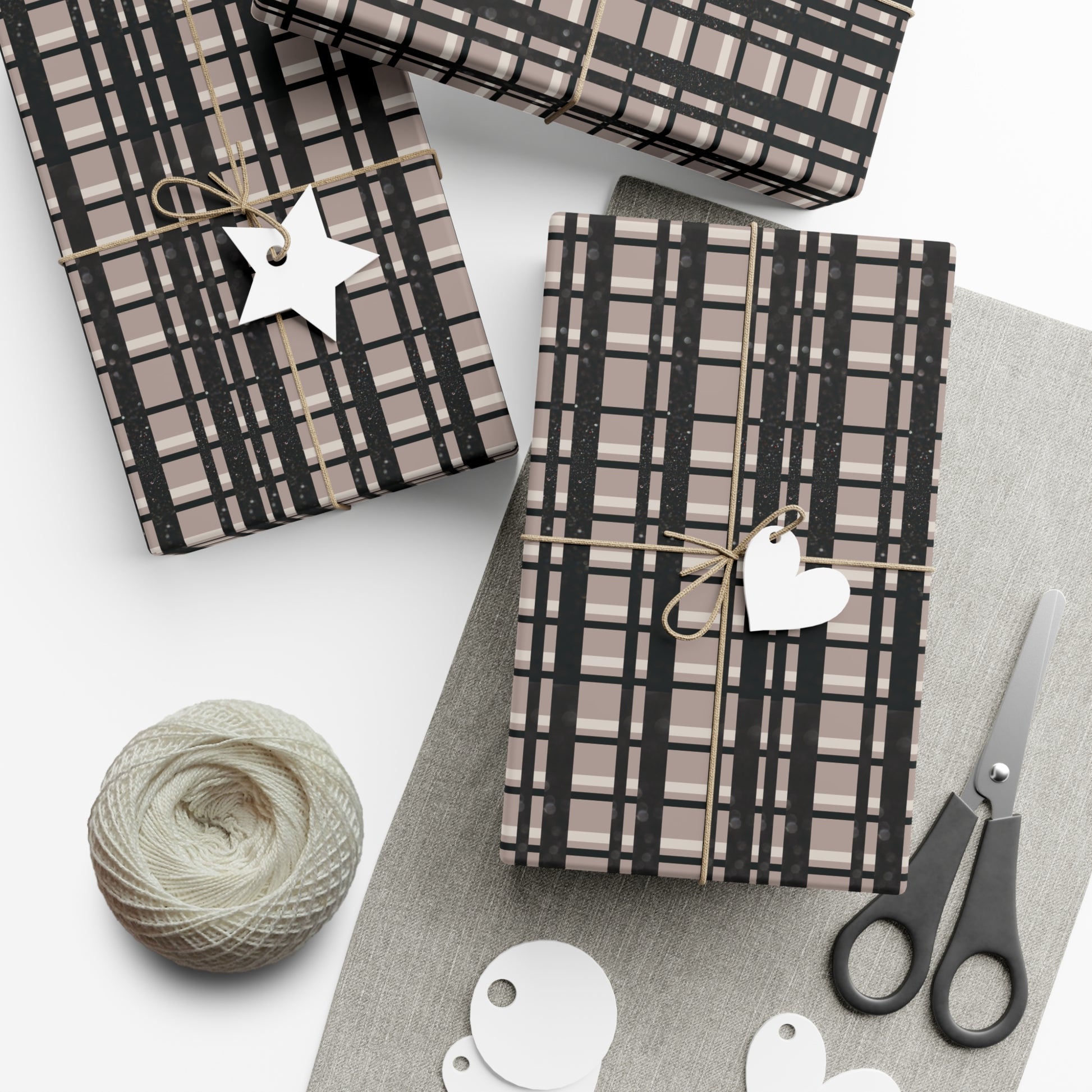 A modern twist on a timeless classic, this kierst plaid gift wrap combines taupe and black tones with a hint of understated shimmer. Its sophisticated pattern balances structure and elegance, perfect for polished gifting moments all year long.