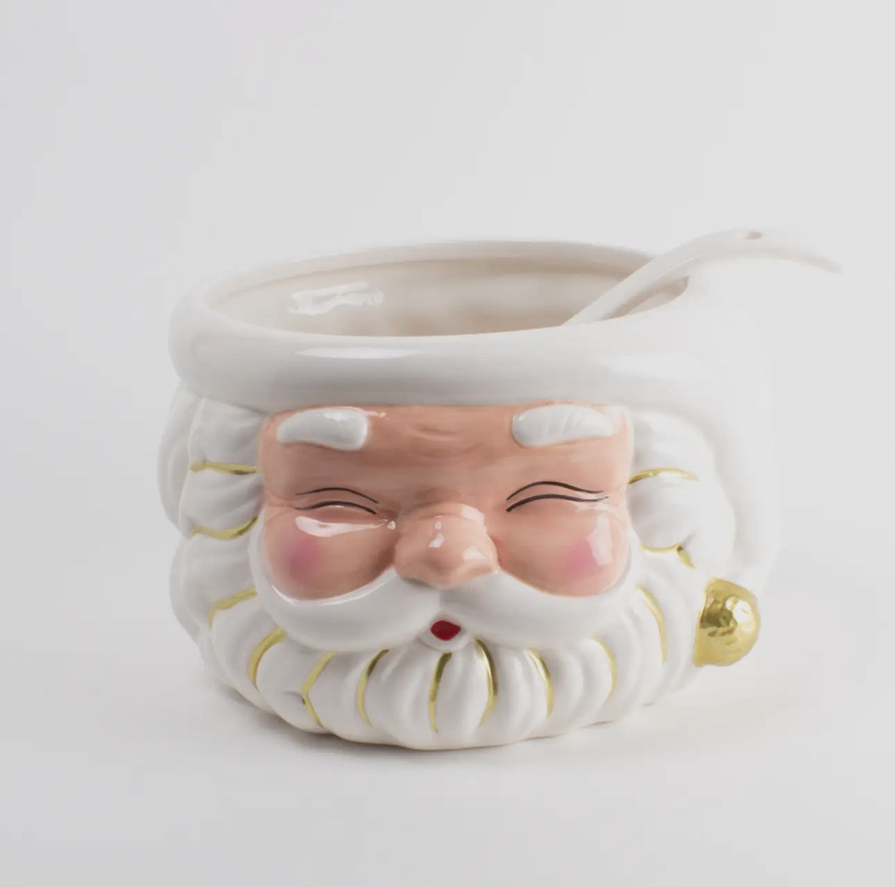 The White Santa Punch Bowl & Ladle brings timeless elegance to your holiday hosting. Hand-painted with gold detailing and a soft, neutral glaze, this classic design complements any tablescape — from traditional to modern. Crafted from ceramic and featuring a coordinating ladle, it holds 120 ounces, making it ideal for festive drinks or as a charming holiday planter. Preorder item — ships early November.